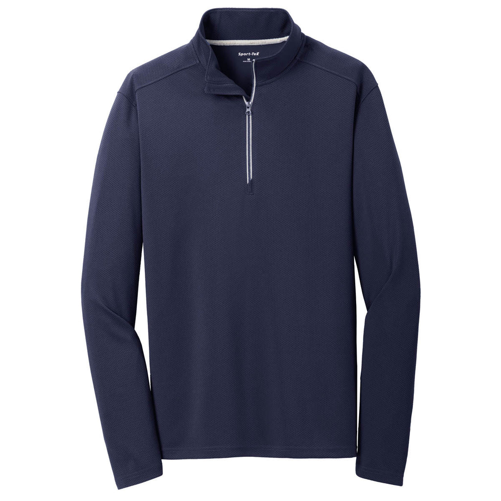 A good corporate quarter zip should be ready for anything. Armed with durable 100% polyester, the Sport-Tek Men's True Navy Textured 1/4-Zip Pullover is ready for anything and a little bit more. Not only is it comfortable, with the aforementioned fabric and a tag-free label that the back of your neck will thank you for, but it offers a chin guard, set-in sleeves, open cuffs and hem, and a contrast zipper & cadet collar. Add your company's custom logo to the left chest and you'll be ready to display your corporate branding in just about any situation, looking clean, professional, and ready for anything.Corresponding Women's Style:Sport-Tek Women's True Navy Sport-Wick Textured 1/4-Zip Pullover