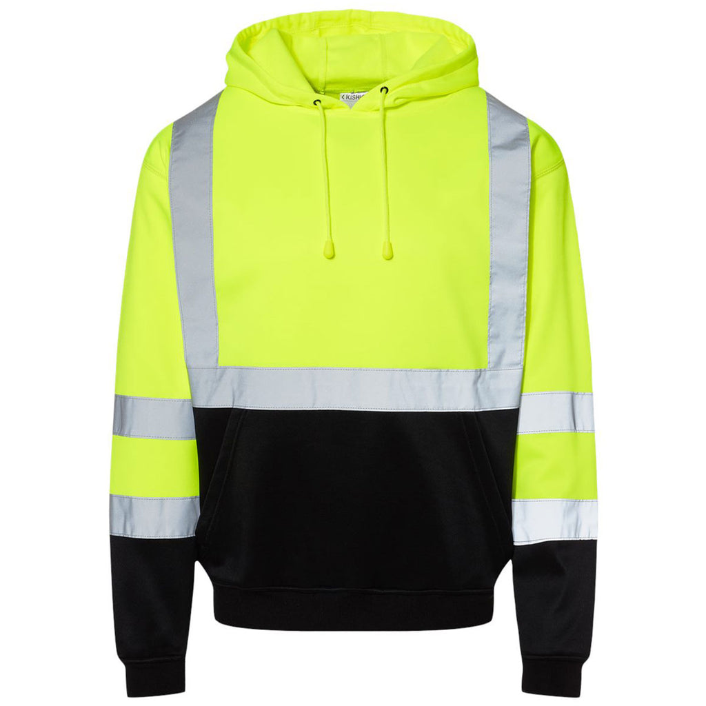 Your screen print company logo can be added to the custom ML Kishigo Men's Lime Hi-Vis Hooded Sweatshirt to serve as part of a uniform and employee apparel when the weather cools off. The polyester sweatshirt material is bright safe]ty yellow on top and black on the lower half for a clean appearance with reflective striping in multiple areas. This keeps workers safe and seen when working on the roadside, the high lines, or anywhere they need to be noticed. If you have a worker who needs something to be noticed, add screen print, and create a custom gift that also serves a purpose.