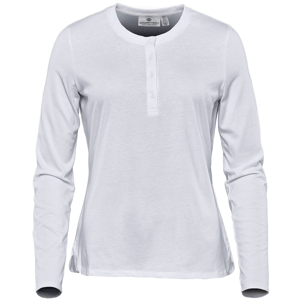 Relax and unwind in a custom Stormtech Women's White Torcello Long Sleeve Henley. This gorgeous henley can be used for almost any purpose with the comfortable versatility it exudes. Taped neck seams, a classic henley placket, and long sleeves mean this shirt is ready for adventure whether that includes a big work project or marking stuff off your spring cleaning list. Add a company logo to use as employee apparel or gifts or try out a custom design to support your organization or cause. Comfort, convenience, and class all come together in this simple henley that is as versatile as you are in life.Corresponding Men's Style:Stormtech Men's White Torcello Long Sleeve Henley