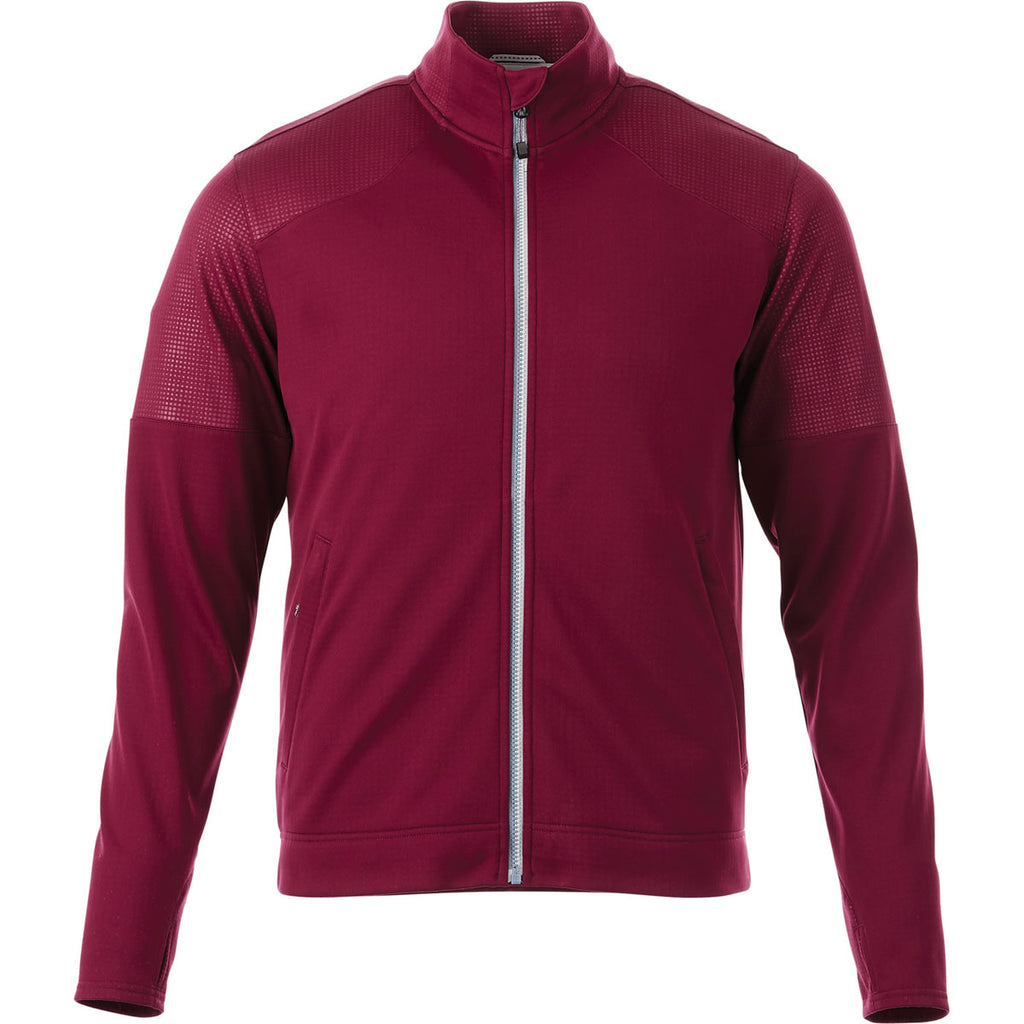 Elevate Men's Maroon Senger Knit Jacket lets you hit the gym or office even in cold weather. Run errands or run a company in style with a custom embroidery knit jacket by Elevate. With graphic shoulder detailing, sleeve cuffs with thumb exits, and earbud cord guide and exit, this jacket offers it all. Available in five different colors and a range of sizes, a custom logo can be placed on this polyester interlocking knit. Choose a company color and offer these jackets as employee apparel or give as corporate gifts to clients. Appropriate for most activities in or out of the work environment. Order yours today!Corresponding Women's Style: Elevate Women's Maroon Senger Knit Jacket