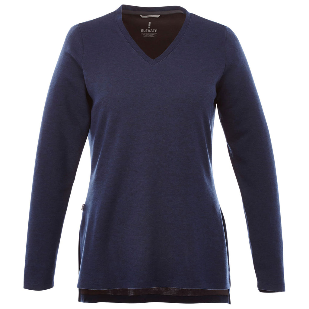 If you are planning a team building event or a company event, the Elevate Women's Metro Blue Heather Bromley Knit V-Neck customized with your company logo is a great choice for a gift for your female employees. It is a versatile sweater ideal for work as well as going out. It is made with washable wool for easy care, and has a dropped back hem with slits at the hips. Your employees can wear this knit in the office but also while they are cheering for their favorite team. They can wear it while shopping, walking through the city or meeting with their friends. Wherever they go they will advertise your brand in a stylish way.Corresponding Men's Style:Elevate Men's Metro Blue Heather Bromley Knit V-Neck
