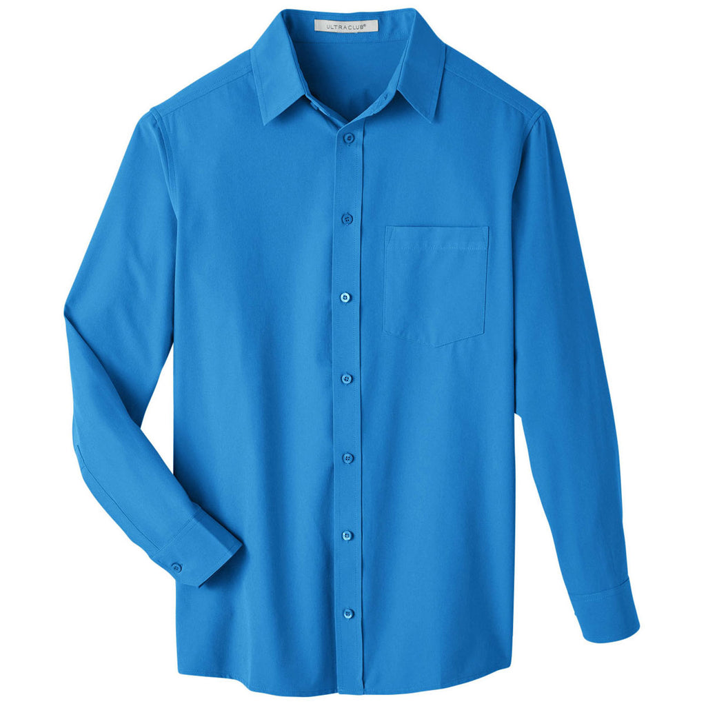 Look and feel great in a custom UltraClub Men's Pacific Blue Bradley Performance Woven Shirt made of a polyester rich woven spandex. Perfect as corporate apparel, this button up has pearlized buttons to match the overall shirt color and a spread collar for the professional look you need and deserve. Add a company logo to use as employee apparel or uniforms in high end settings where appearance is key. Adjustable cuffs and stretch performance offers a custom, active fit and easy care means daily wear is not an issue. Complete with a left chest pocket, this is a must have garment.Corresponding Women's Style: UltraClub Women's Pacific Blue Bradley Performance Woven Shirt