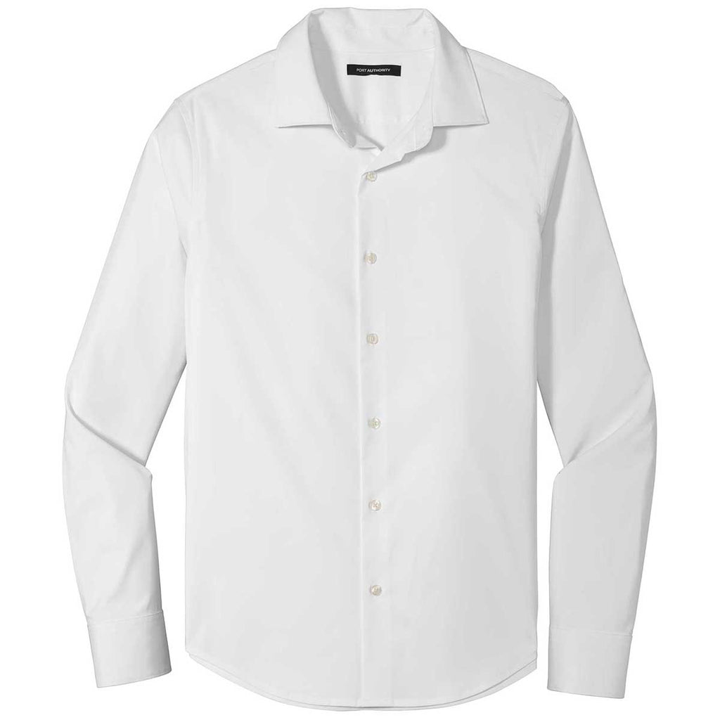 Sleek style is create with the custom embroidery Port Authority Men's White City Stretch Shirt. Every professional needs a selection of well made button downs and this shirt provides. The comfort and performance of this classic are the epitome of corporate style. Even on those stressful days, this odor fighting, wrinkle resistant shirt has your back. Add a company logo to use as company uniforms or wear to corporate events. Made of a poly rich spandex blend, the open collar shirt has a French placket, pearlized buttons, and rounded, adjustable cuffs. Place an order today to have several of these in your personal wardrobe or as employee gifts when needed.